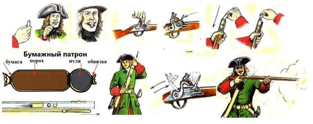 使用纸质弹药筒装填火器时,需要先咬开弹药筒的后端,将一小部分火药通过这个破口倒在火器的药池上,然后将弹药筒中的火药倒入枪管内,最后用推杆将弹药筒的其余部分连同铅弹一起推入枪管底部。被压扁的纸质弹壳此时起到了药垫的作用。发射时,扣动扳机,火石打击铁片产生火花,点燃药池中的火药,火药通过枪管中的小孔引燃主装药。