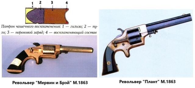 其中比较受欢迎的是1859年由W.埃利斯和J.怀特开发并获得专利的杯形底火弹。这种弹药实际上是环形底火弹的变种,但可以用于没有贯通弹膛的左轮手枪,从而绕过了怀特的专利。杯形底火弹从前方插入弹膛,而弹膛后部顶部有一个小槽,击锤可以通过该槽击打杯形底部的边缘。杯形底火弹左轮手枪的一个显著特征是位于弹膛右侧的卡扣——通过卡扣上的针,射击后的弹壳可以从弹膛中推出。使用这种弹药的左轮手枪包括“普兰特”、“马林”和“莫尔文与布雷”的口袋左轮手枪。