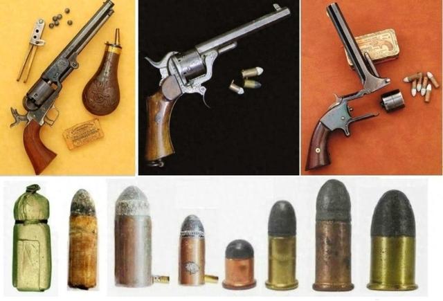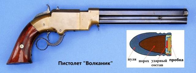 不过,弗洛贝尔的子弹仅用于室内训练射击,威力很小。随后,美国史密斯和韦森公司推出了一款无弹壳子弹,其威力同样不强。这种子弹是一颗后部中空的子弹,内部装有黑火药和击发药。然而,这款无弹壳子弹实际上是一种实验性设计,非常不可靠,且威力不足以用于实战。尽管如此,霍勒斯·史密斯和丹尼尔·韦森基于此设计开发了一款原创的多发快速装填手枪“Volcanic”,并在1854年得到了受其理念吸引的奥利弗·温彻斯特的财务支持,成立了“火山连发武器公司”(Volcanic Repeating Arms Company),开始批量生产这种手枪。