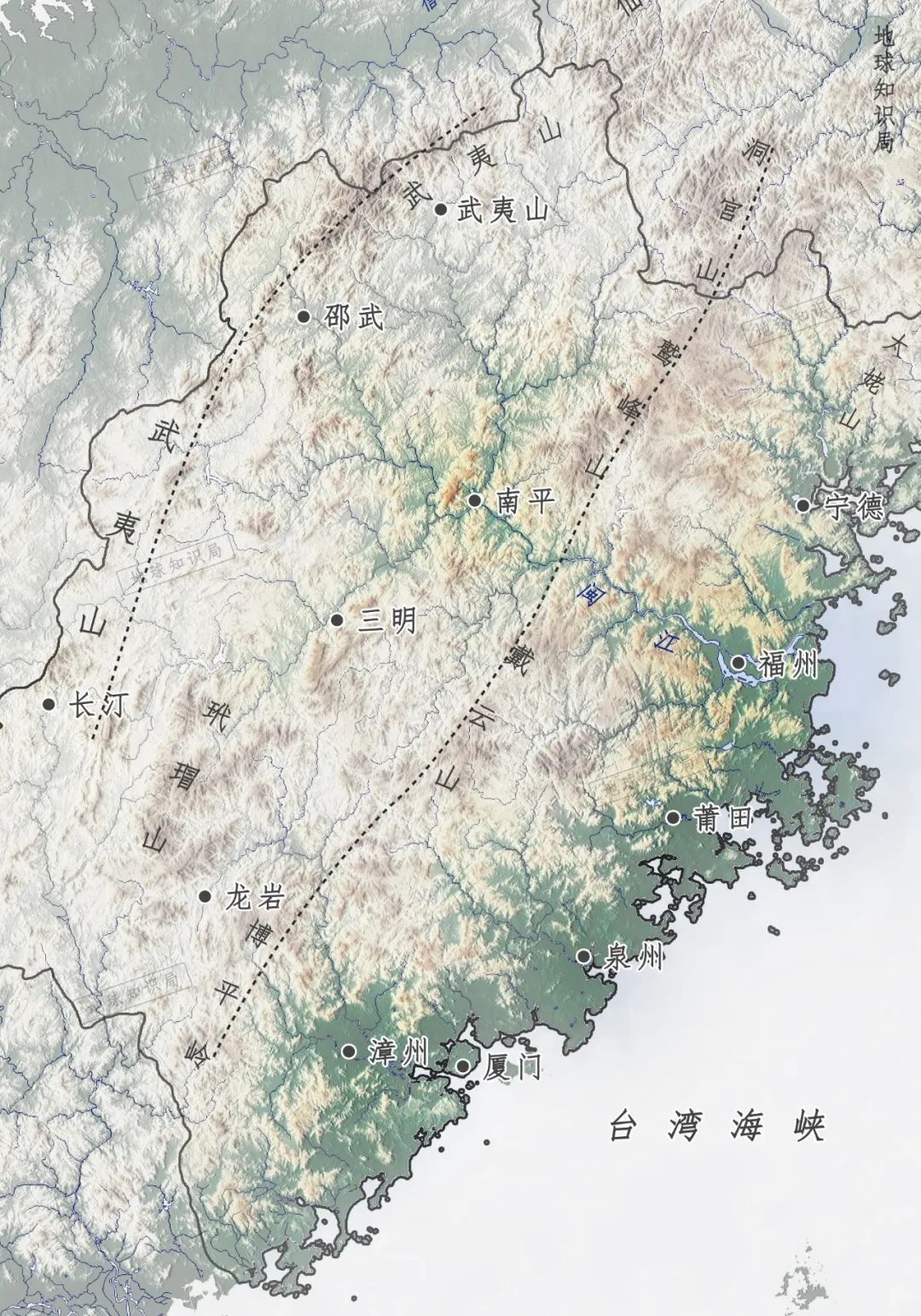 福建山地的排布也很有规律,其境内有两列北北东走向的大山带,一列为闽西大山带,由武夷山脉组成,位于与江西交界处;另一列为闽中大山带,由鹫峰山、戴云山脉和博平岭组成。这两列山脉相互平行,绵延达500余公里,构成了山地的主体。
