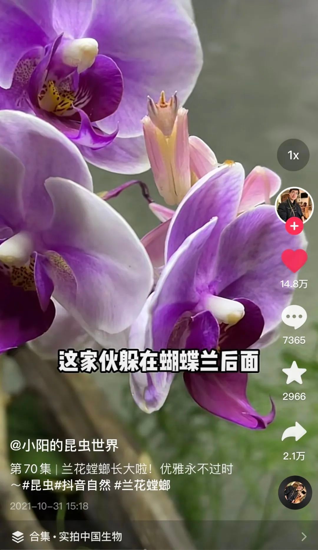 @小阳的昆虫世界,也是一位在福州的昆虫科普创作者,名叫郑霄阳,拥有248.4万粉丝。他最火的一部作品是一段关于兰花螳螂的十二秒视频。这段视频展现了三只娇小美丽的粉白色螳螂的细微动作,出人意外地火“出圈”了,吸引了近四千万人次观看,有144万人点赞。