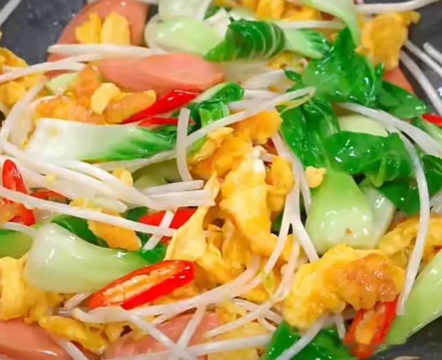 4.倒入上海青和绿豆芽,火腿肠翻炒均匀,炒至青菜断生!
