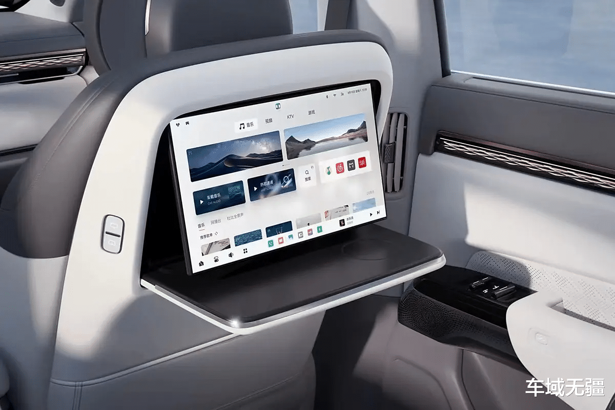 前排座椅靠背上还设置了2.5K 13英寸OLED娱乐屏与折叠小桌板。扶手箱下方的储物格可以选装冰箱,后排中央扶手上面也有一块独立的6英寸触控屏,用于调节空调、座椅、音乐和氛围灯,舒适性配置属实是拉满了。