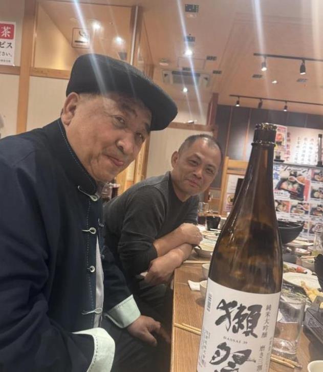 照片中,姜昆与几位友人围坐在餐桌旁,桌上摆放着日式清酒和中国茅台,中西合璧的饮食搭配,透露出一种轻松惬意的氛围。