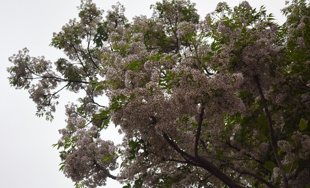 除了种种优点外,苦楝树的观赏价值也相当不错。初夏时节,淡紫色的花穗缀满枝头,远看像飘着缕缕轻烟,走近还能闻到一股甜香味。