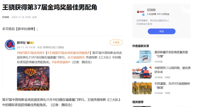 王骁在刚刚闭幕的金鸡奖颁奖典礼上获得了最佳男配角。