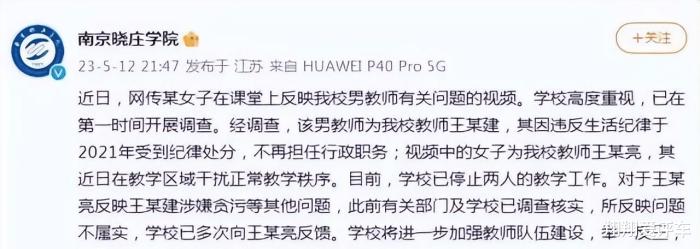 5月12日,南京晓庄学院发布通报:上课的男教师王某建,因违反生活纪律于2021年受到纪律处分,不再担任行政职务。女子也是该校老师,名王某亮。两人一起被停止教学工作。同时针对王某建涉嫌贪污等问题,学校已调查核实,情况不属实。