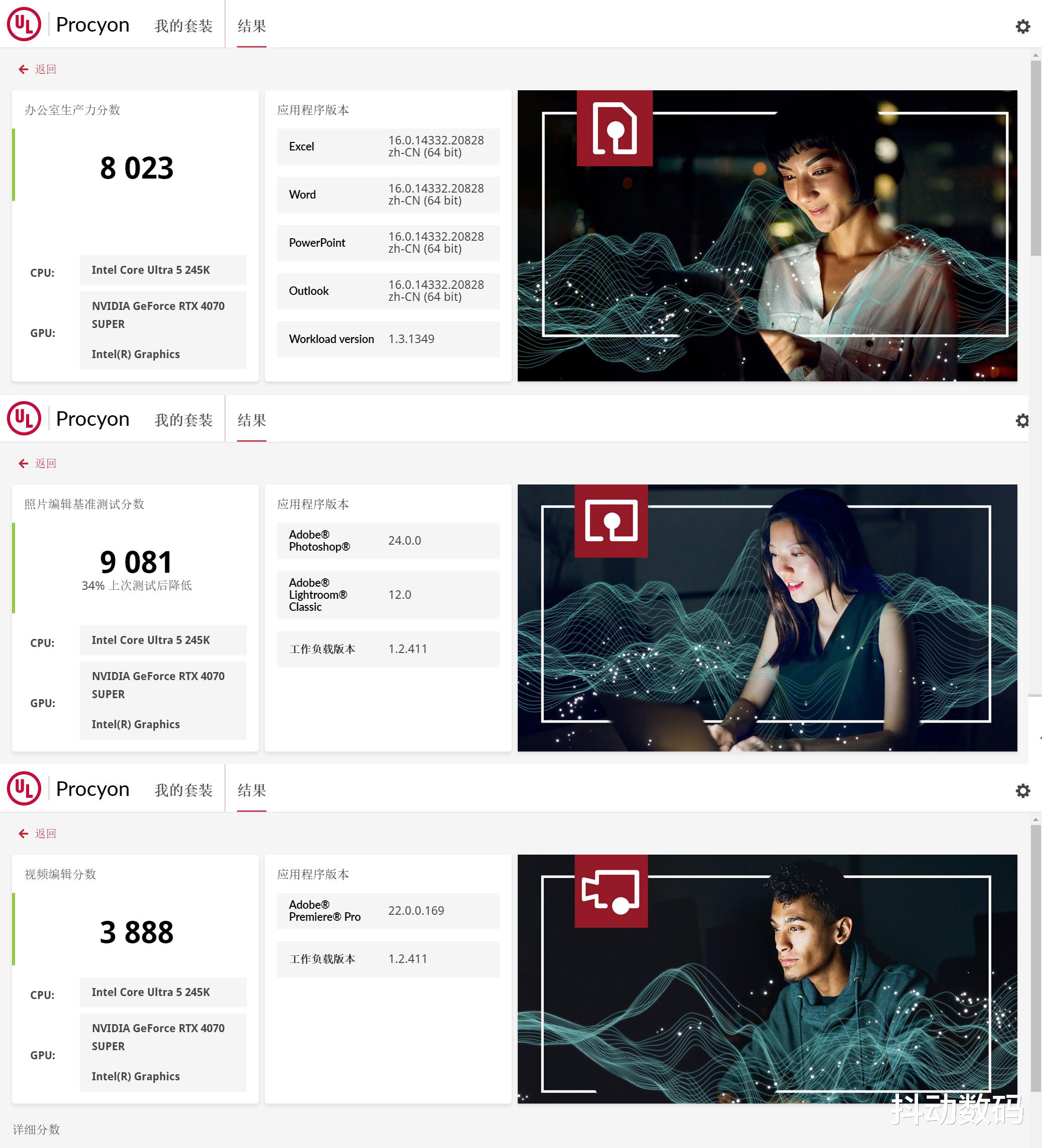 生产力部分,这点intel还是有一定优势的。这里搭配4070SUPER显卡测试目前这套配置下办公生产力分数:8023;照片编辑基准测试分数:9081;视频编辑分数:3888。