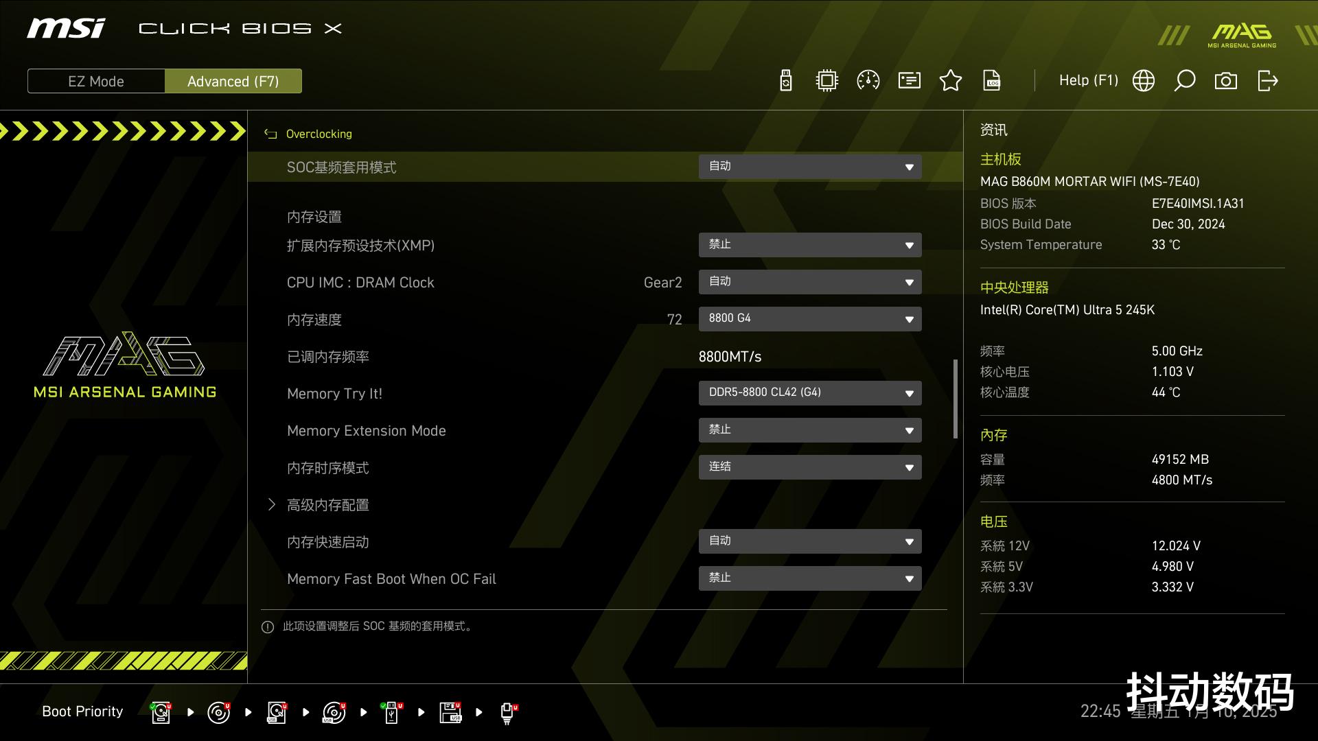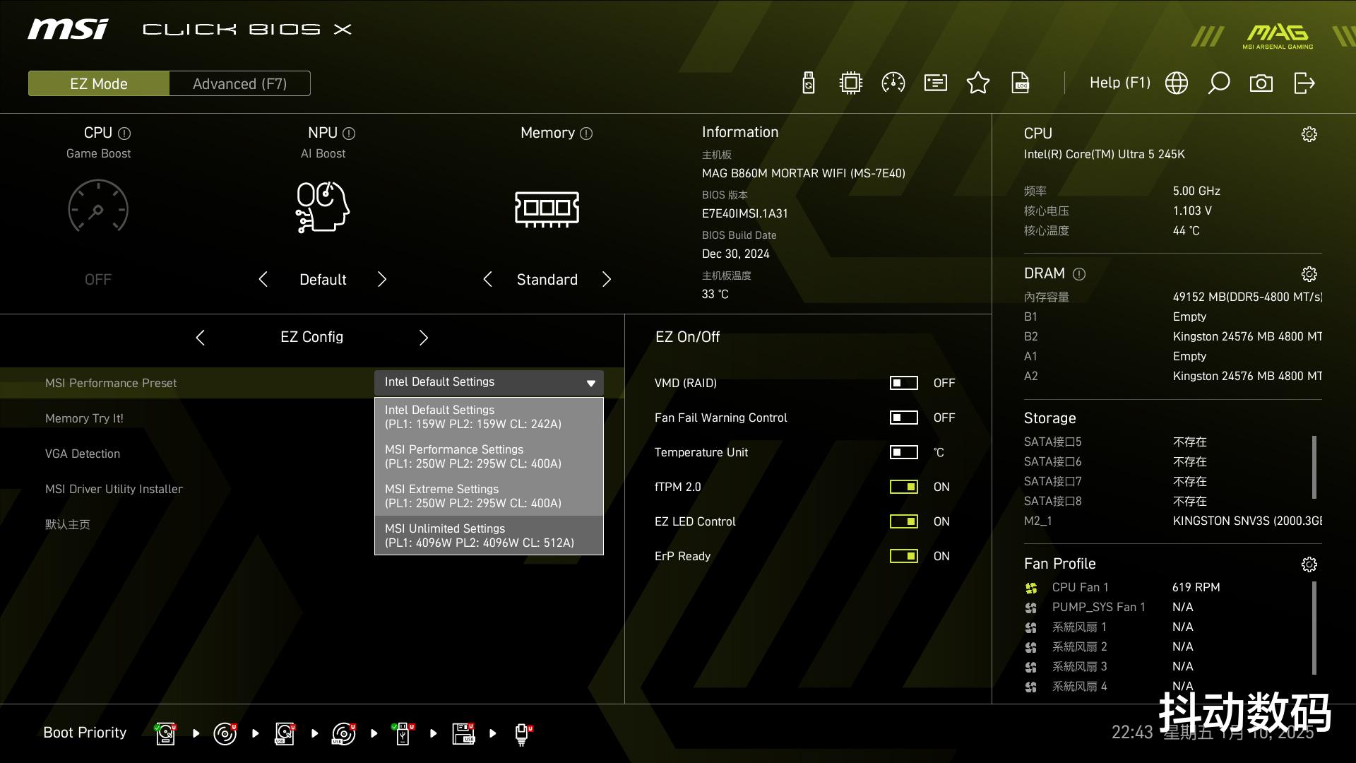 首先是bios方面,MAG B860M MORTAR WiFi主板也升级到了全新的bios界面。很多功能都可以直接在EZ Mode界面进行设置,比如NPU AI Boost开启、XMP模式等等。