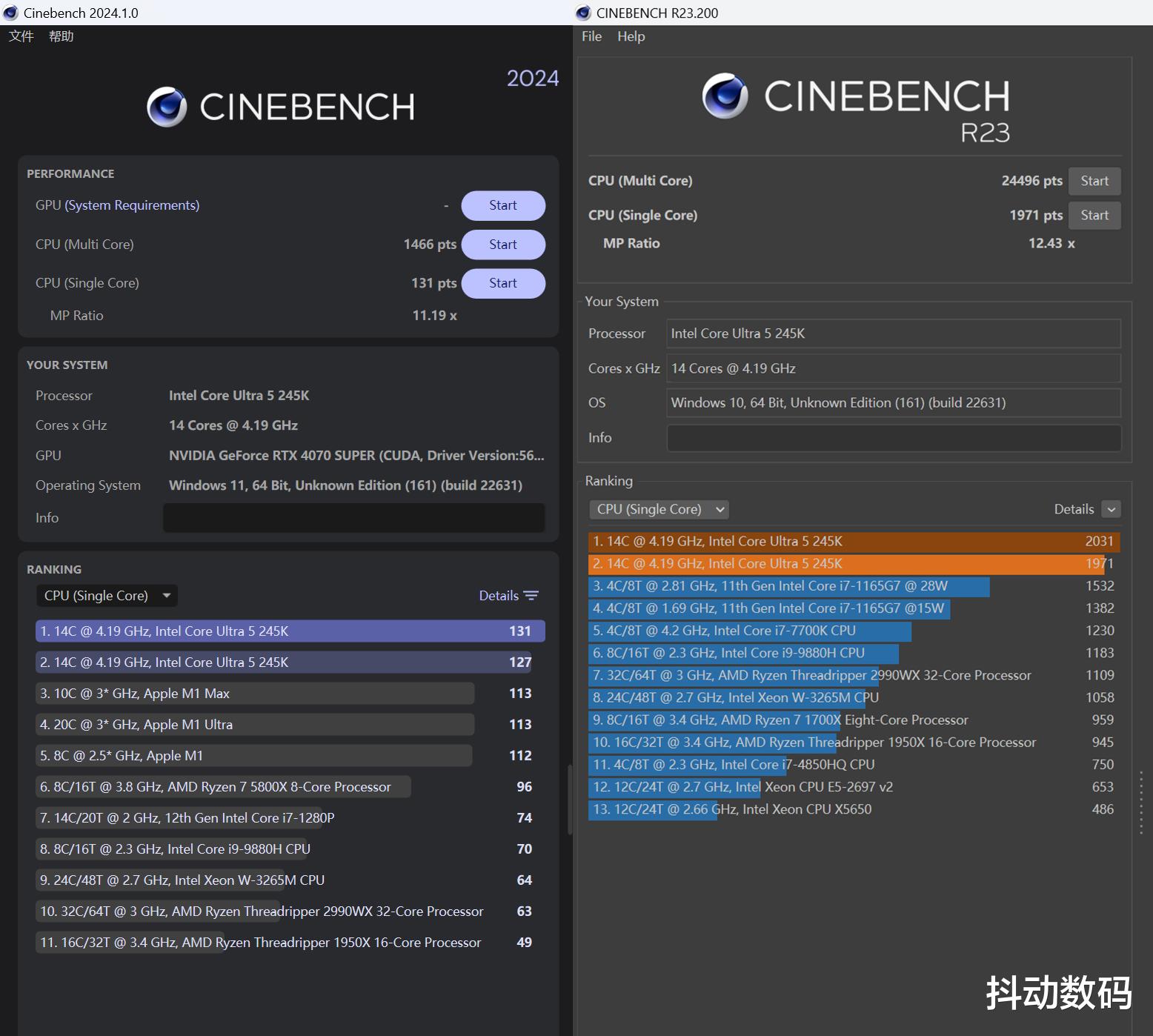 Cinebench R23测试CPU多核分为24496 pts,单核 1971 pts;