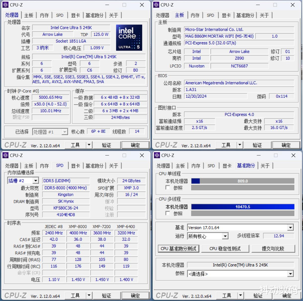 搭配intel Ultra5 245K 处理器的CPU-Z测试成绩为多核性能:10470.5,单核:809;