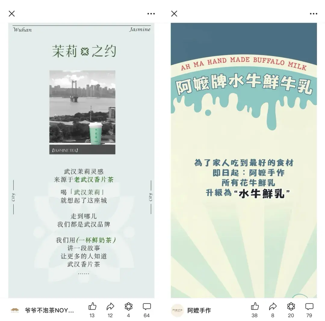 再比如奶茶品类中,区域性品牌会用到有本地特色的原材料,像是武汉的品牌爷爷不泡茶以“老武汉香片茶”为灵感做花香调奶茶,阿嬷手作的招牌产品,最核心卖点是用到了广西水牛鲜牛乳。