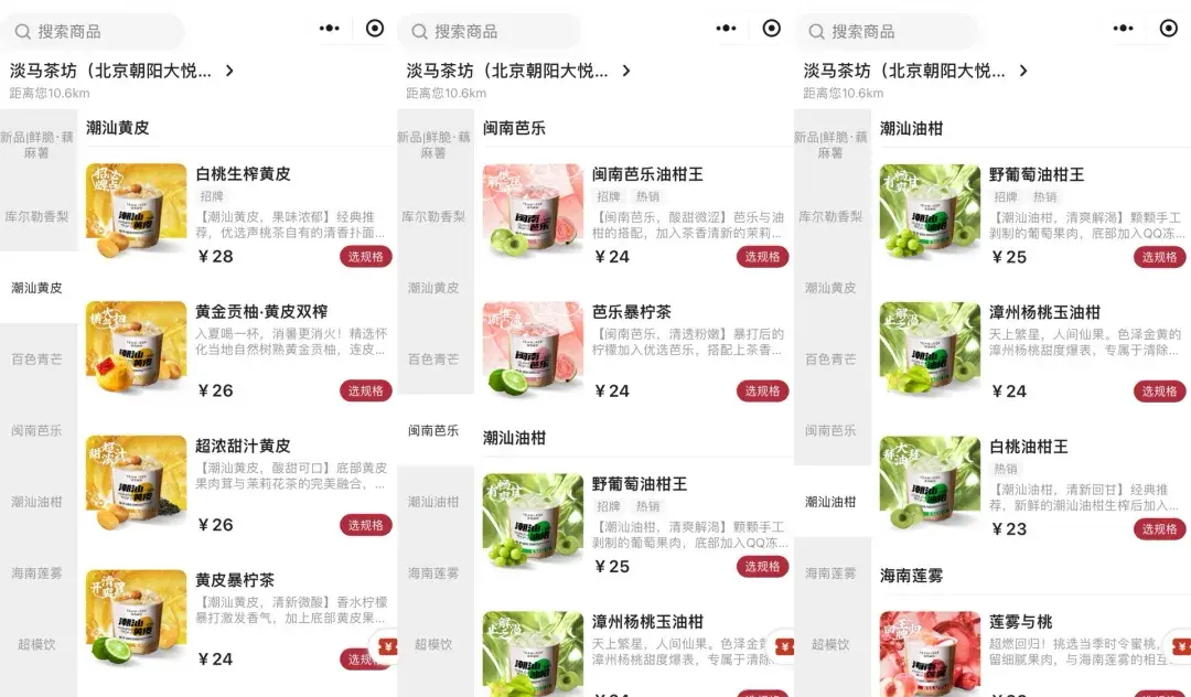 但现在热门的区域性品牌,大多都是自带“地域特色”进入——比如在果茶品类中,区域性品牌倾向于选用具有鲜明地域特征的水果,像淡马茶坊的品牌定位是“潮汕果茶”,产品主要用黄皮、油柑、芭乐等水果,不常见而且极具特色,能直接激发消费者的猎奇心理。