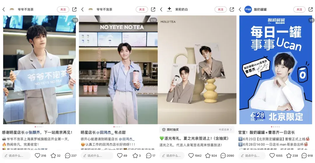 今年爷爷不泡茶在昆明新店开业时邀请了焉栩嘉,在上海新店开业时则邀请了张颜齐。今年7月茉莉奶白在苏皖地区达到“百店规模”时,也邀请了施展、姚柏南、赵品霖等明星在无锡、苏州、南京等城市的门店体验“一日店长”。这种方式快速吸引了年轻粉丝到店打卡获得同款,同时明星店长们也会在社交平台积极推广活动,助力品牌在年轻人群中破圈。
