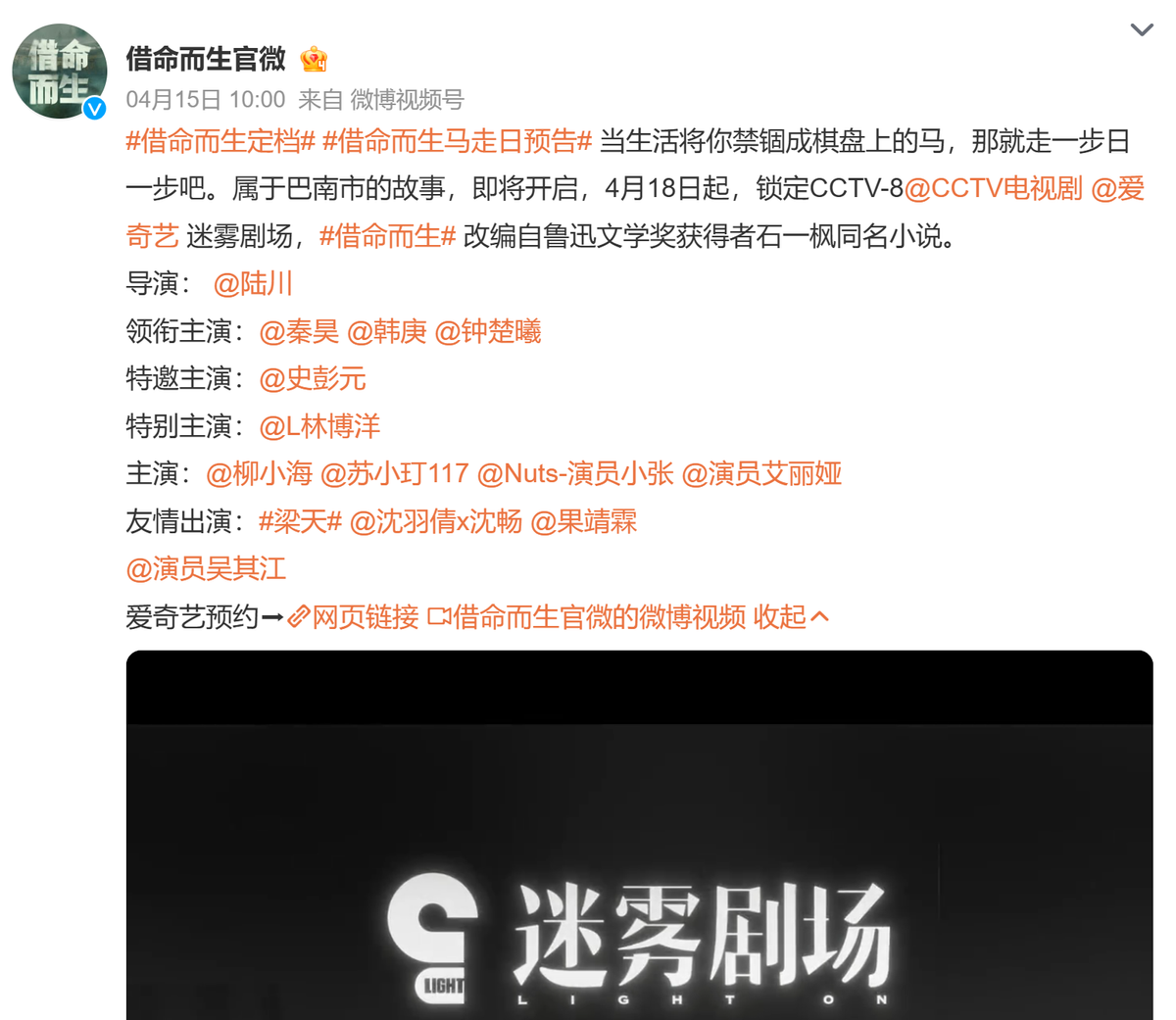 《借命而生》定档于4月18日上星央视八套,桃厂同步播出,这一次央妈与迷雾剧场一起出手,这部让观众盼了一年的悬疑大剧排面可不小。
