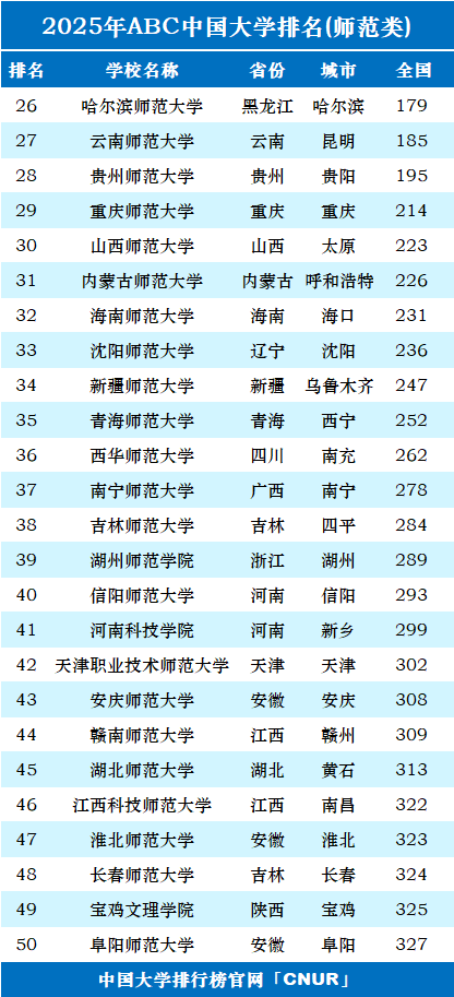 年 ABC 中国大学排名,不仅是师范院校发展的 “成绩单”,更吹响了未来师范教育的奋进号角。随着国家对师范教育投入加大,期待这些院校培育更多教育菁英,也盼更多师范院校突围崛起,共同绘就中国师范教育的璀璨新篇!