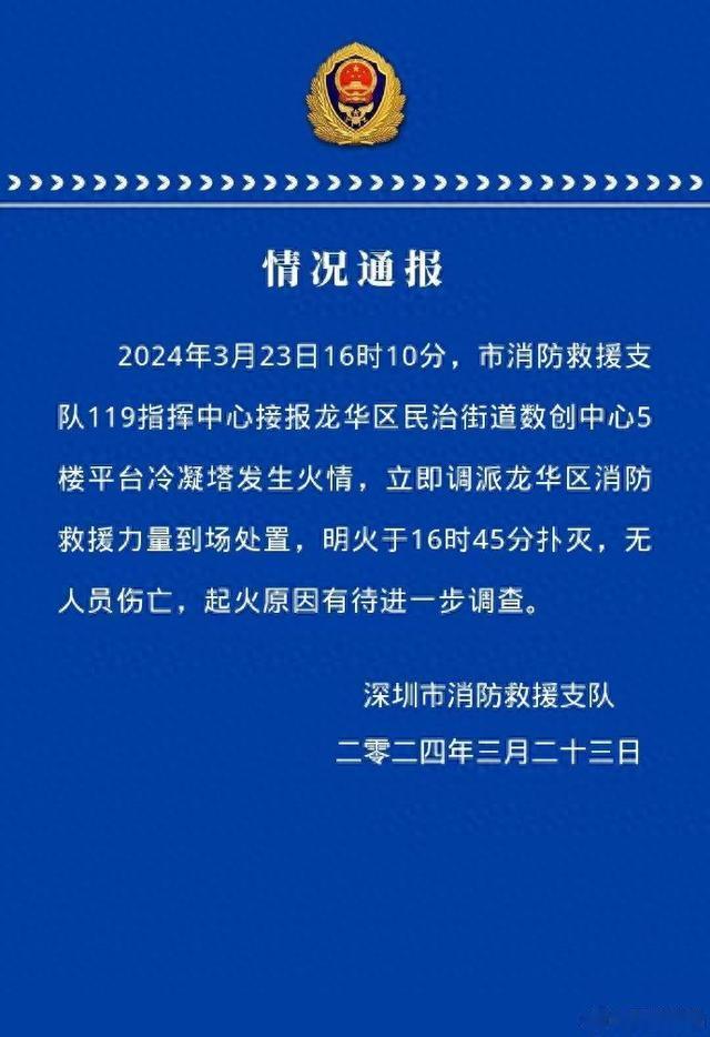 3月23日,深圳市消防救援支队发布情况通报:2024年3月23日16时10分,市消防救援支队119指挥中心接报龙华区民治街道数创中心5楼平台冷凝塔发生火情,立即调派龙华区消防救援力量到场处置,明火于16时45分扑灭,无人员伤亡,起火原因有待进一步调查。