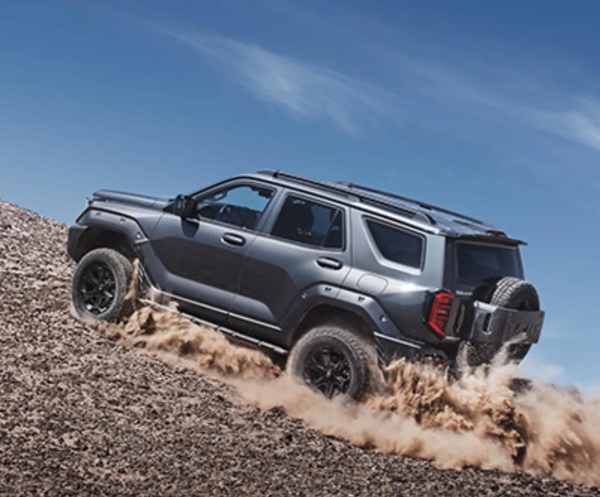 首先,先来看看坦克400的外观设计。作为一款硬派越野车,它的外观承袭了“机甲风格”,线条硬朗,造型独特,非常符合越野车应有的气质。大尺寸熏黑进气格栅配合粗壮的铬饰条,营造出一种强烈的视觉冲击。而配备的犀利LED大灯,无论是日间行驶还是夜间行驶,都能够轻松吸引路人的目光。此外,高离地间隙、宽大的轮眉和全地形轮胎更是让坦克400显得气势不凡,突显出它应对各种复杂路况的潜力。