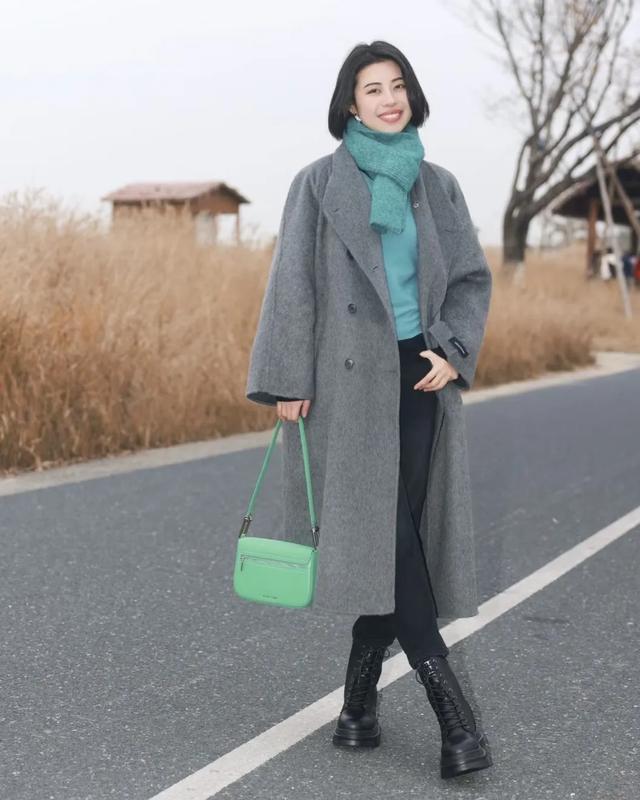 基础款的黑白灰大衣,配上黑色烟管裤和黑色马丁靴,兼容性很强,松弛绿色毛衣和围巾点亮整体配色,秋冬懒人出门必备。