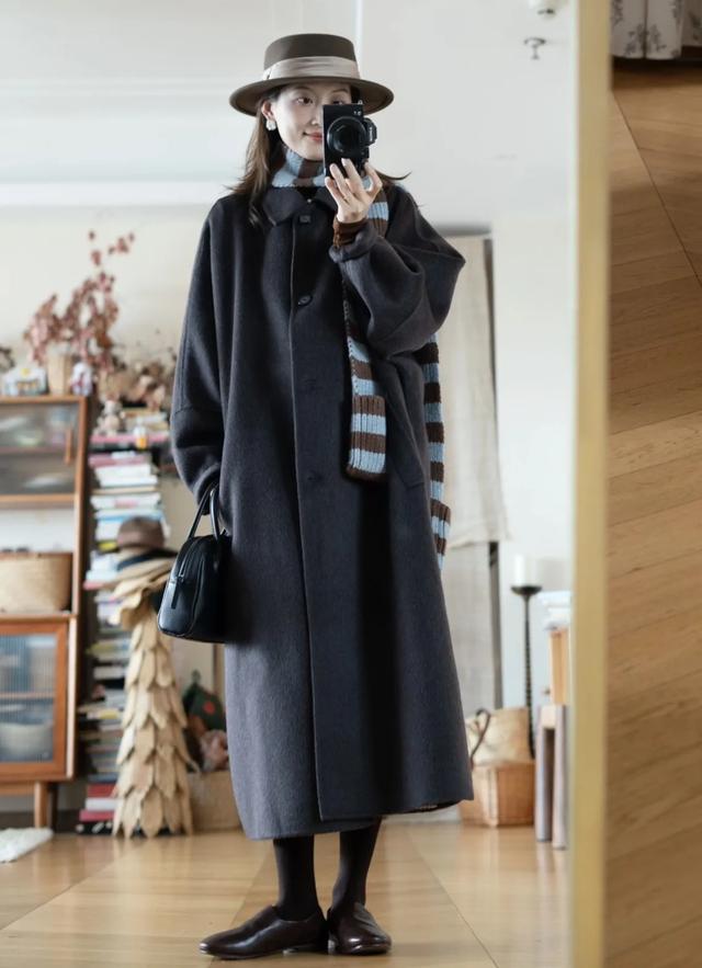冬天大衣的版型很多,下图中的版型更偏复古文艺一些,搭配亮眼条纹围巾,保暖又有质感,除了搭配黑灰色连裤袜,咖色系也很适合,很有秋冬氛围感。