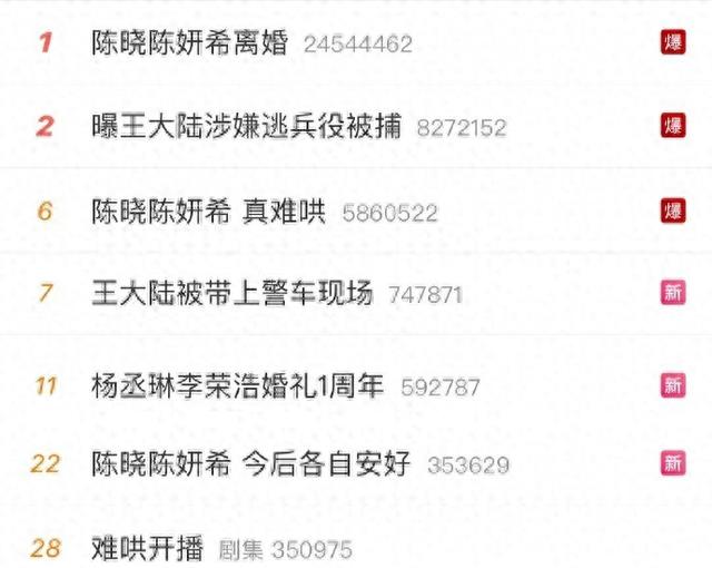 陈晓和陈妍希宣布离婚、杨丞琳和李荣浩庆祝婚礼一周年,还有王大陆被捕的消息。