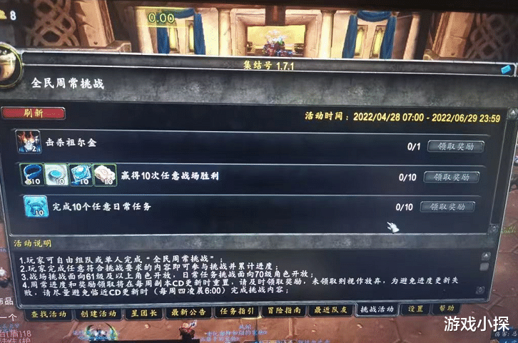 最新的集结号任务为“周常任务”,玩家每周都可以完成,分别是击杀祖阿曼的尾王祖尔金送两个伊利达雷印记、赢10场战场送40个战场牌子,完成10个日常任务送10个公正徽章。说白了就是玩家保证一定的日常活跃度,官方就送50个牌子,相比NAXX打本送合剂送小神龙的活动逊色了不少。