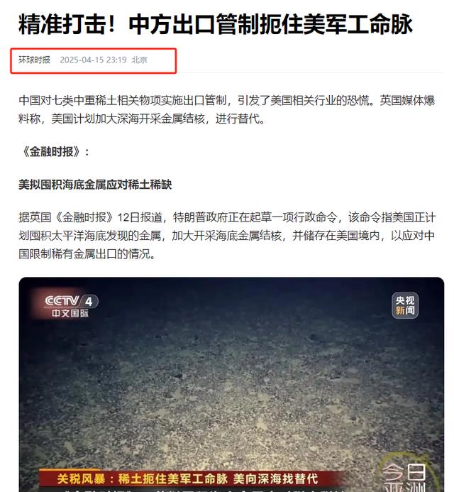 信源:环球时报 2025年4月15日 关于“精准打击!中方出口管制扼住美军工命脉”的报道