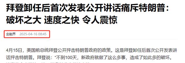 信源:金融界 2025年4月16日 关于“拜登卸任后首次发表公开讲话痛斥特朗普:破坏之大 速度之快 令人震惊”的报道
