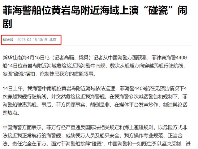 信源:新华网 2025年4月15日 关于“菲海警船位黄岩岛附近海域上演“碰瓷”闹剧”的报道
