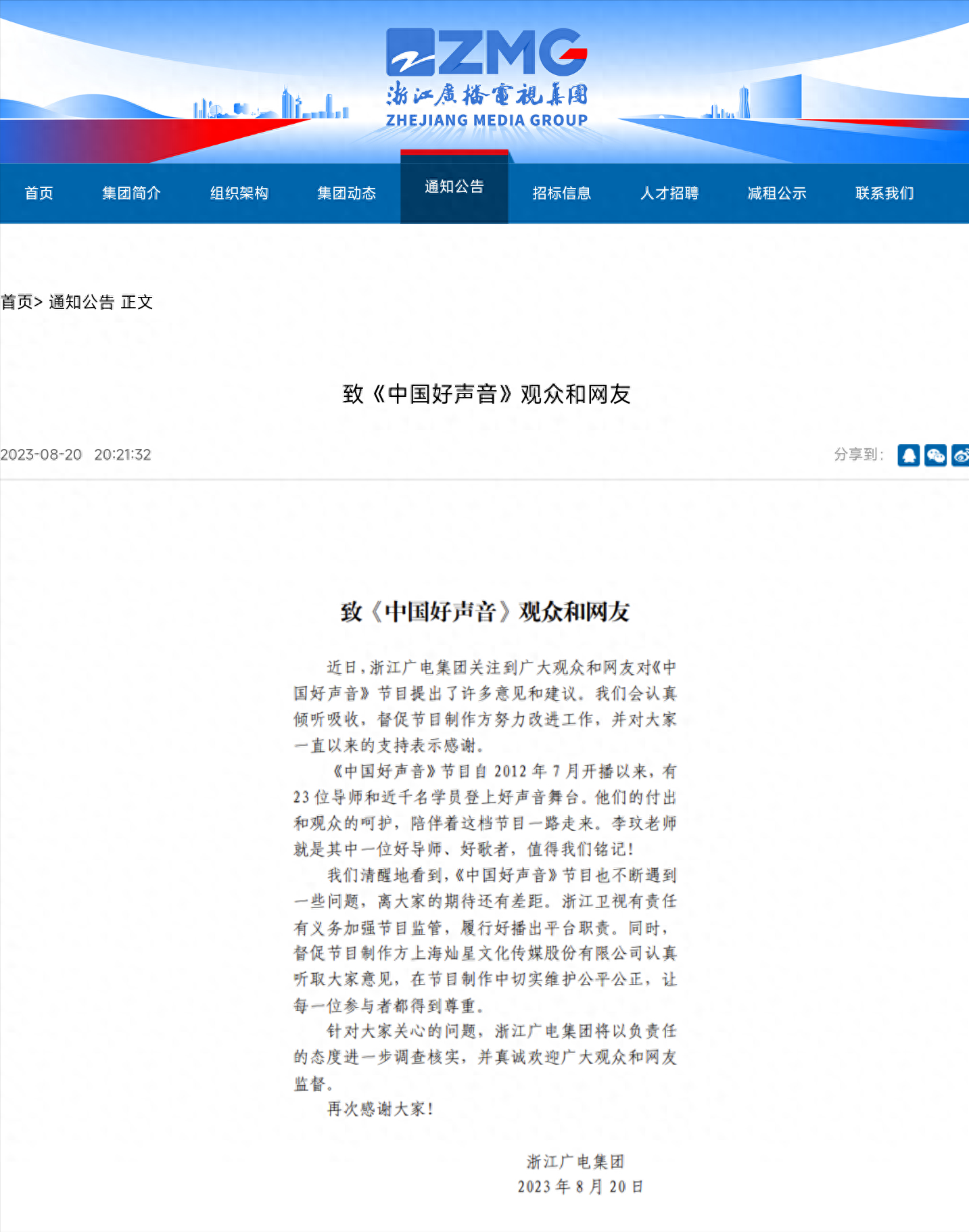 已故知名歌手李玟录音曝光之后,中国好声音节目制作方受到了社会大众的严厉批评和抵制,但节目播出平台浙江卫视所属的上级单位浙江广电集团悄无声息。随着网络舆论的不断发酵,眼看舆情大火烧到了浙江卫视的时候,20日晚,浙江广电集团终于在官网上公告回应中国好声音的观众和网友。