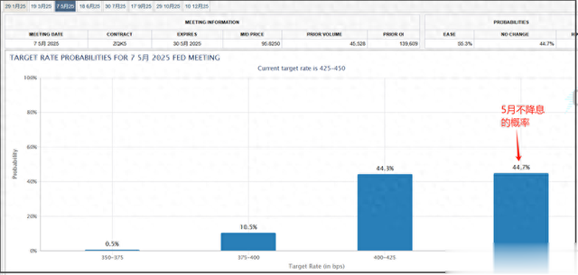 也就是目前市场预期1月和3月的议息会议,是大概率不会继续降息,5月也有较大概率不会降息。