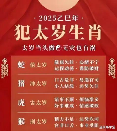 2025年为农历乙巳年(蛇年),犯太岁的生肖包括: