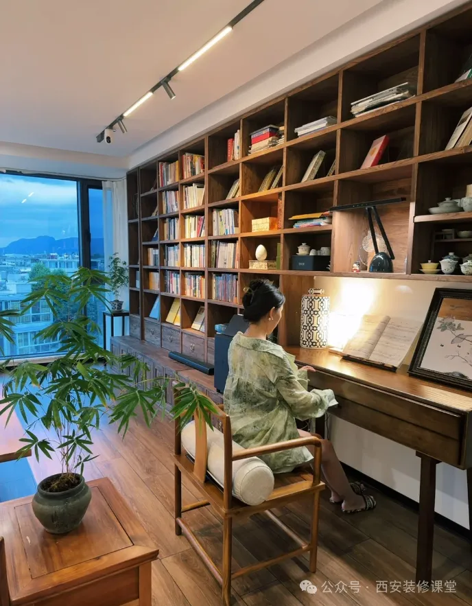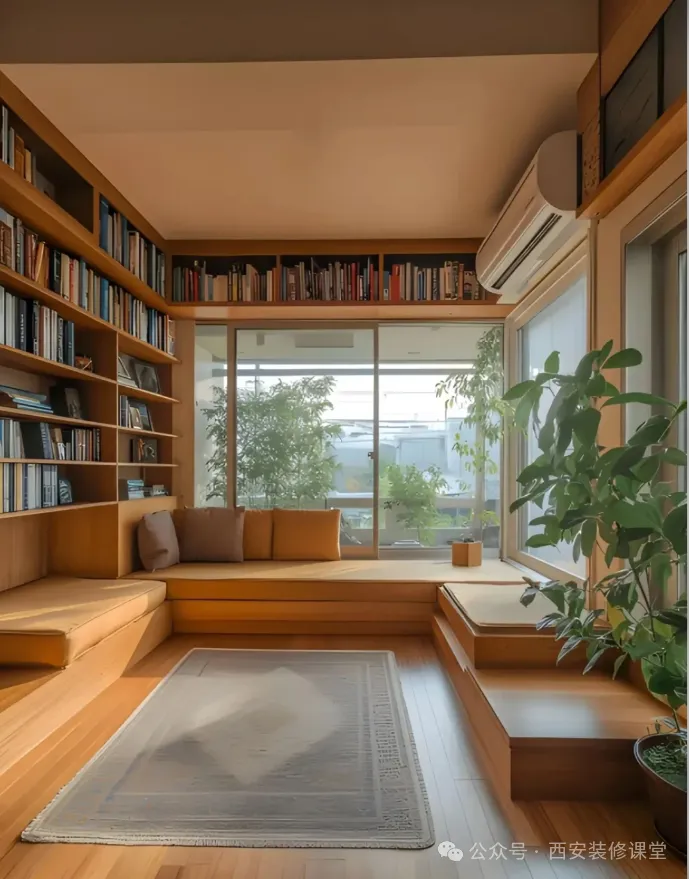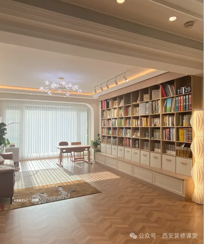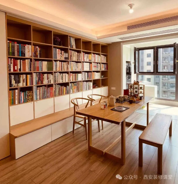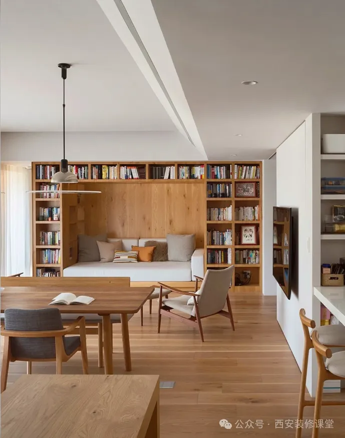 书墙+卡座,第一可以满足休闲就坐阅读,第二拓展了收纳储物,第三拿取高处书籍更加方便,第四代替去客厅化的沙发功能