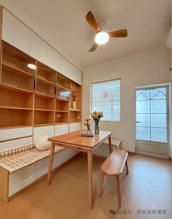 小户型彻底去客厅化设计,书墙+卡座+餐桌,就可以满足客餐厅的所有功能,让客餐厅功能一体化设计,去客厅化,更符合生活的实际需求