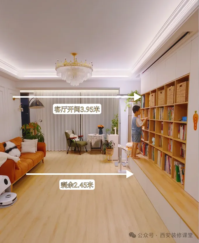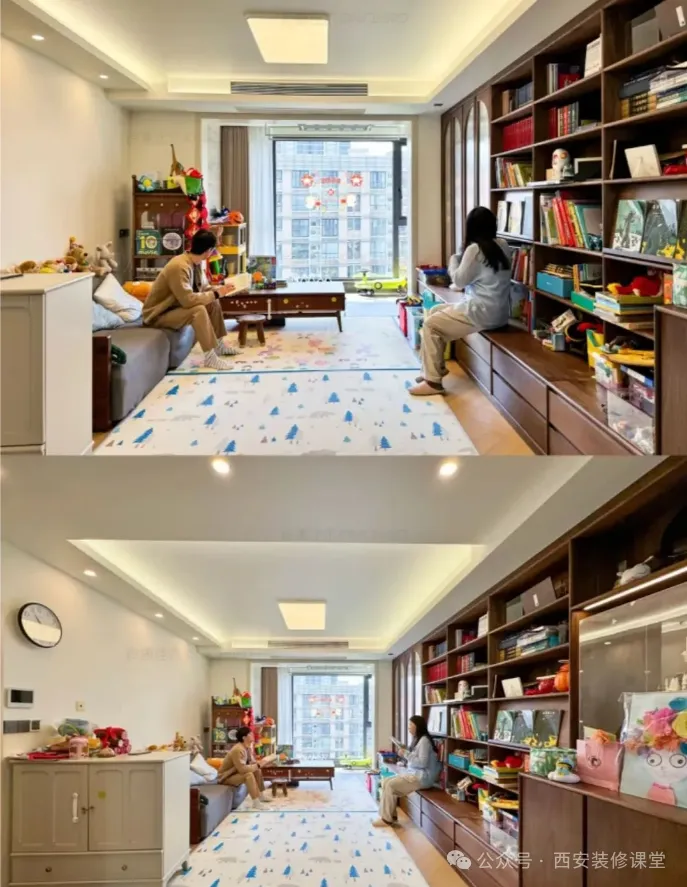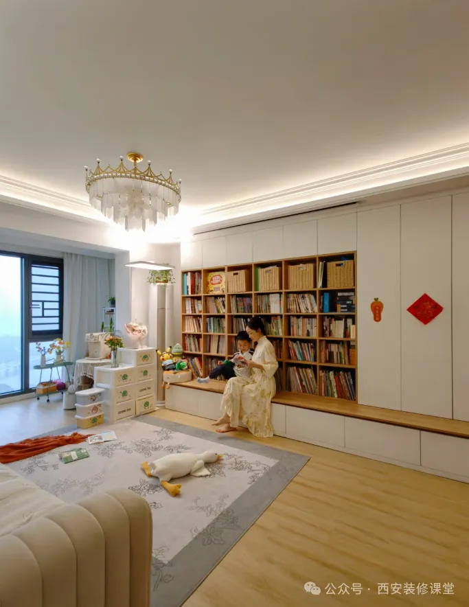 如图所示,满墙收纳柜局部书柜结合,满足储物以及书籍的收纳,同时也避免了大面积开放难打理问题;下方卡座满足了座椅以及收纳功能,可以满足全家人坐下来阅读,同时也满足孩子拿取高处书籍的方便