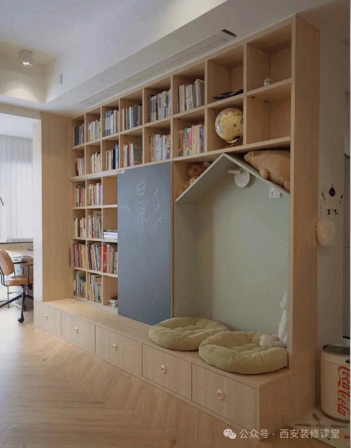 专门为孩子打造的书墙,有卡座,有卡通造型,有舒适的坐垫,同时还有可以供随时涂鸦的黑板墙,功能和颜值兼顾