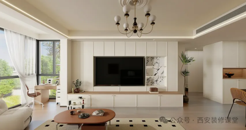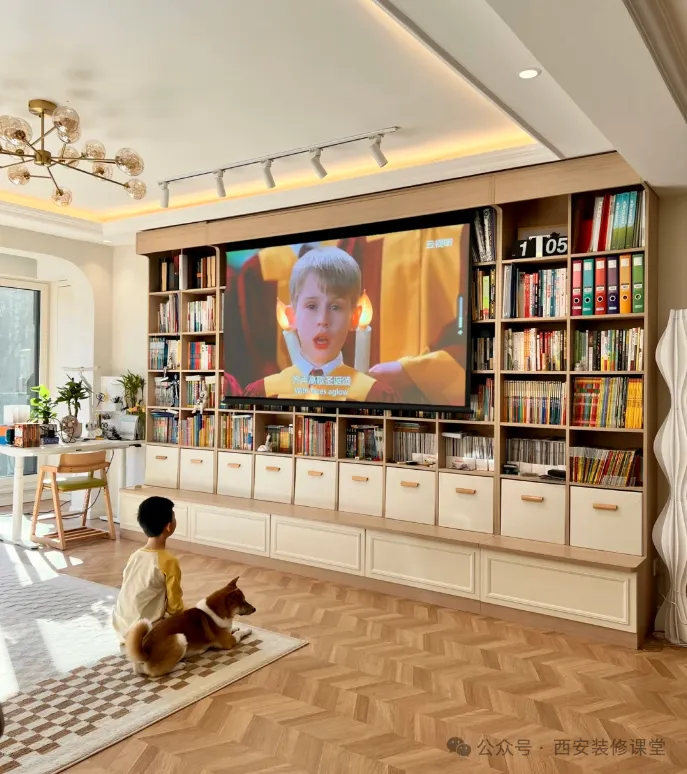 满墙电视柜,局部满足书籍的收纳,下方同样可以满足卡座的定制,随时可以满足休闲阅读,同时也拓展了客厅的收纳能力