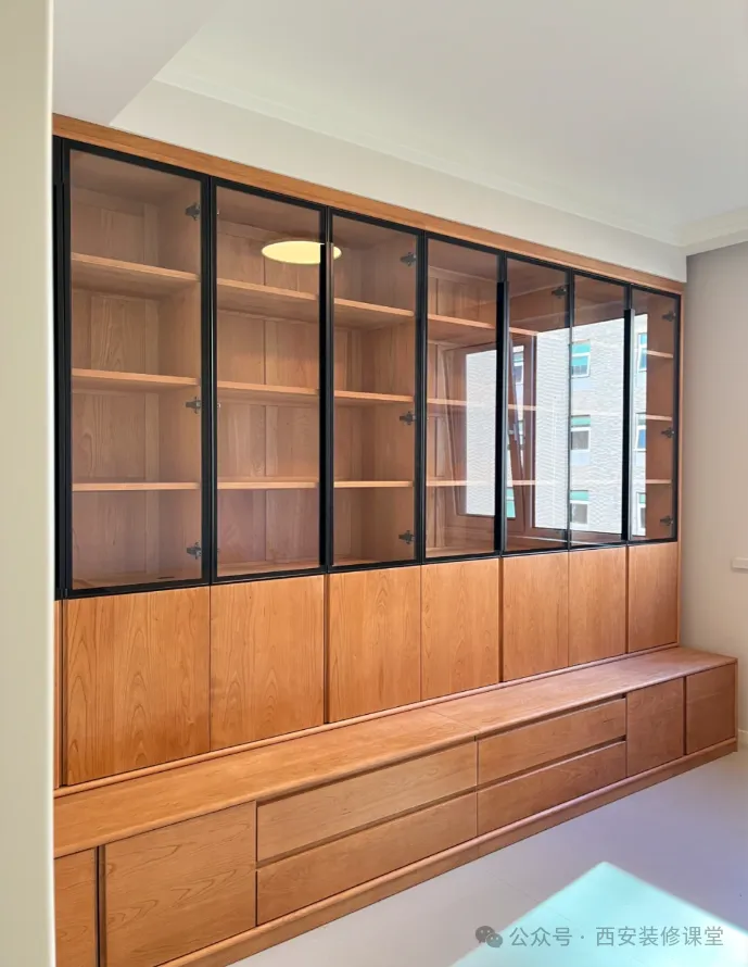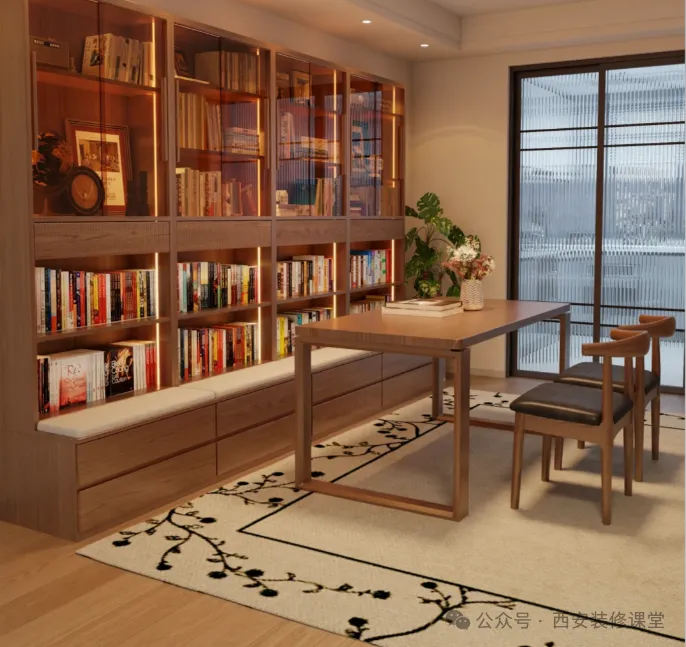 如图全封闭书柜,局部玻璃柜门,下方封闭柜门,卡座同样满足一部分杂物收纳;卡座可以满足休闲和随时阅读的功能