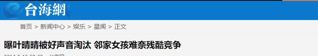 信息来源:台海网 2014-9-10——《曝叶晴晴被好声音淘汰 邻家女孩难奈残酷竞争》