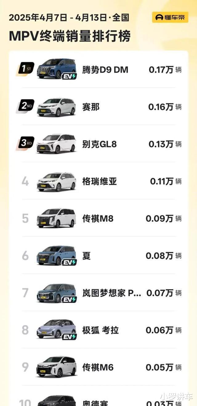 2025年4月第二周的MPV销量榜一出,我就纳闷了:赛那这是咋了?