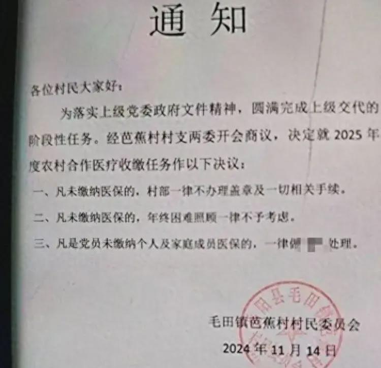 一纸“医保催缴通知”,让湖南岳阳县一名村干部火速登上舆论风口。通知内容粗暴直接:未缴医保者,办事免谈,困难照顾取消,党员更得看着办。这话的硬核程度,让围观群众读完都有点脊背发凉。显然,这种“土政策”的执行方式,不仅“火候”失控,还狠狠打了基层治理的脸。