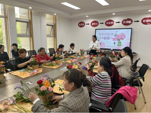 活动伊始,由专业的花艺师进行现场教学,从花材的选择、色彩的搭配到插花技巧,老师耐心细致地讲解每一个步骤,让参与者即便是初次接触插花,也能轻松上手,享受创作的乐趣。活动现场氛围热烈而融洽,邻里之间互相帮助,交流心得,在花艺师的指导下,一朵朵鲜花在大家的巧手下被赋予了新的生命,一篮篮色彩斑斓、形态各异的插花作品逐一呈现,每个人的脸上都洋溢着幸福的笑容。在这样的氛围中,不仅增进了邻里感情,也让邻里之间的距离悄然拉近。