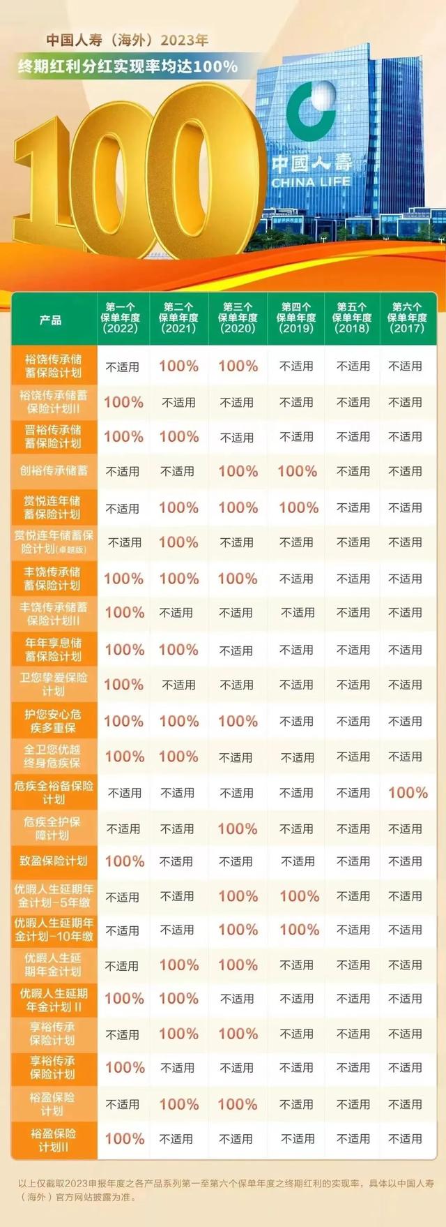 国寿海外最新所公布的 2023 年分红实现率,其旗下所有产品的终期红利实现率都达到了 100%,并且还有多款产品连续多年都保持着 100%的达成状态!