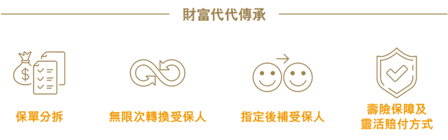 ② 可无限次地转换受保人/候补受保人:从第 1 个保单周年日起就能够进行操作,能够轻松达成财富传承。与此同时,还可以最多指定 2 名候补受保人,并且设定好他们的优先次序,以此保证财富持续地滚动积存,一代代地传承下去。
