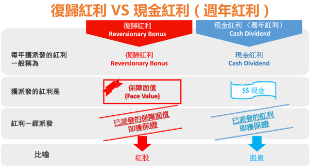 周年红利所派发的为现金,一旦进行派发就能够得到保证,可以随时进行提取领用或者留于账户之中累积生息。复归红利所派发的是保额,所以在提取红利之时,只能够取出与保额相对应的现金价值,红利需要按照一定的折现率进行折现,提取得越早,折现的损失就越大。