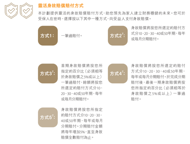 ③ 身故赔偿支付方式很灵活:有 5 种身故赔偿支付方式,能够助力保单持有人预先为家人构建起财务稳固的未来。