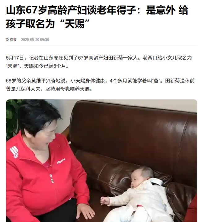 信息来源:新京报 2020-05-20 山东67岁高龄产妇谈老年得子:是意外 给孩子取名为“天赐”