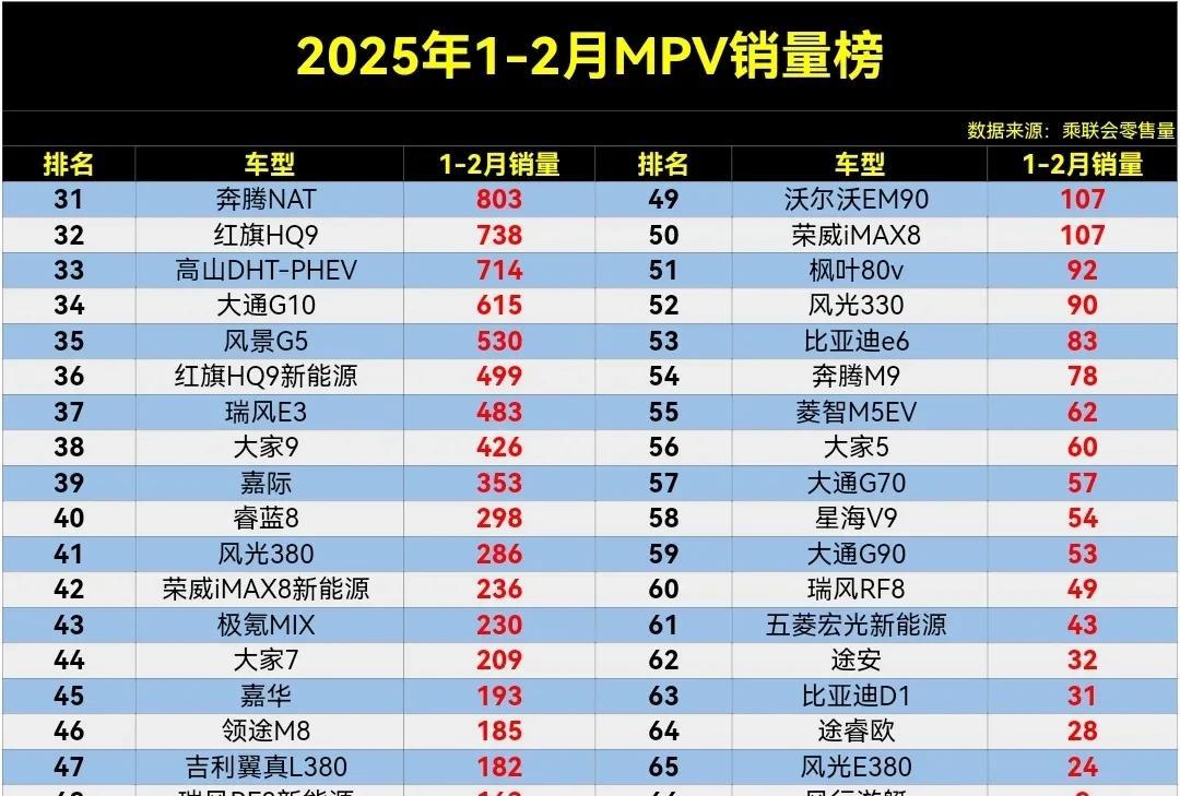 在现代社会,汽车已经不仅仅是代步工具,而是许多家庭生活的一部分,尤其是在家庭成员较多、出行需求复杂的情况下,这一需求愈发明显。MPV(多功能乘用车)因其宽敞的空间和灵活的座椅布局,一直以来都被家庭和企业所青睐。然而,随着竞争的加剧,MPV市场的风云变幻愈发引人注目。在这一市场中,不仅有几款车型遥遥领先,还有一些原本风光的车型逐渐被边缘化。今天,我们就来分析2025年1-2月的MPV销量排行榜,深入探讨市场格局、消费者偏好以及未来发展趋势。