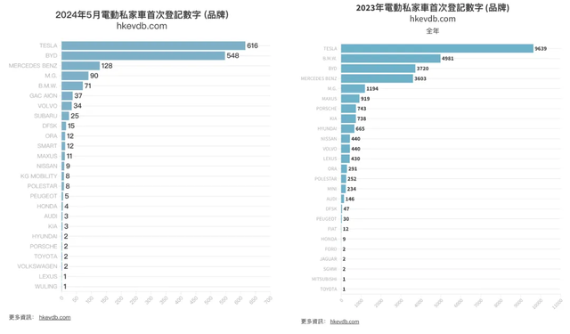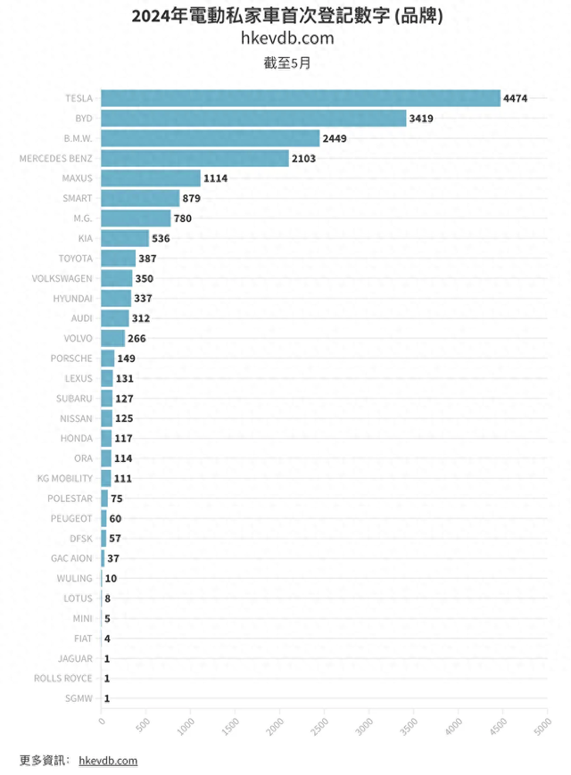 近日,香港电动车统计网站发布今年截至5月中国香港地区的最新销量数据。其中,特斯拉在中国香港的销量超过4400辆,稳居销量榜首。