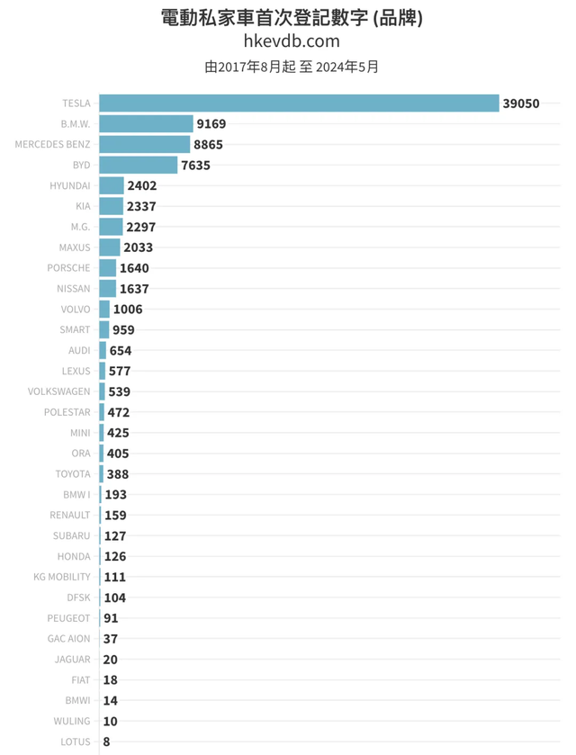 网友发现,将统计时间的范围拉得越大,特斯拉的销量优势就越明显。香港电动车统计网站的数据显示,自2017年8月到今年5月,在香港地区登记的特斯拉车辆已超过3.9万辆,是第二名宝马的4倍还多!